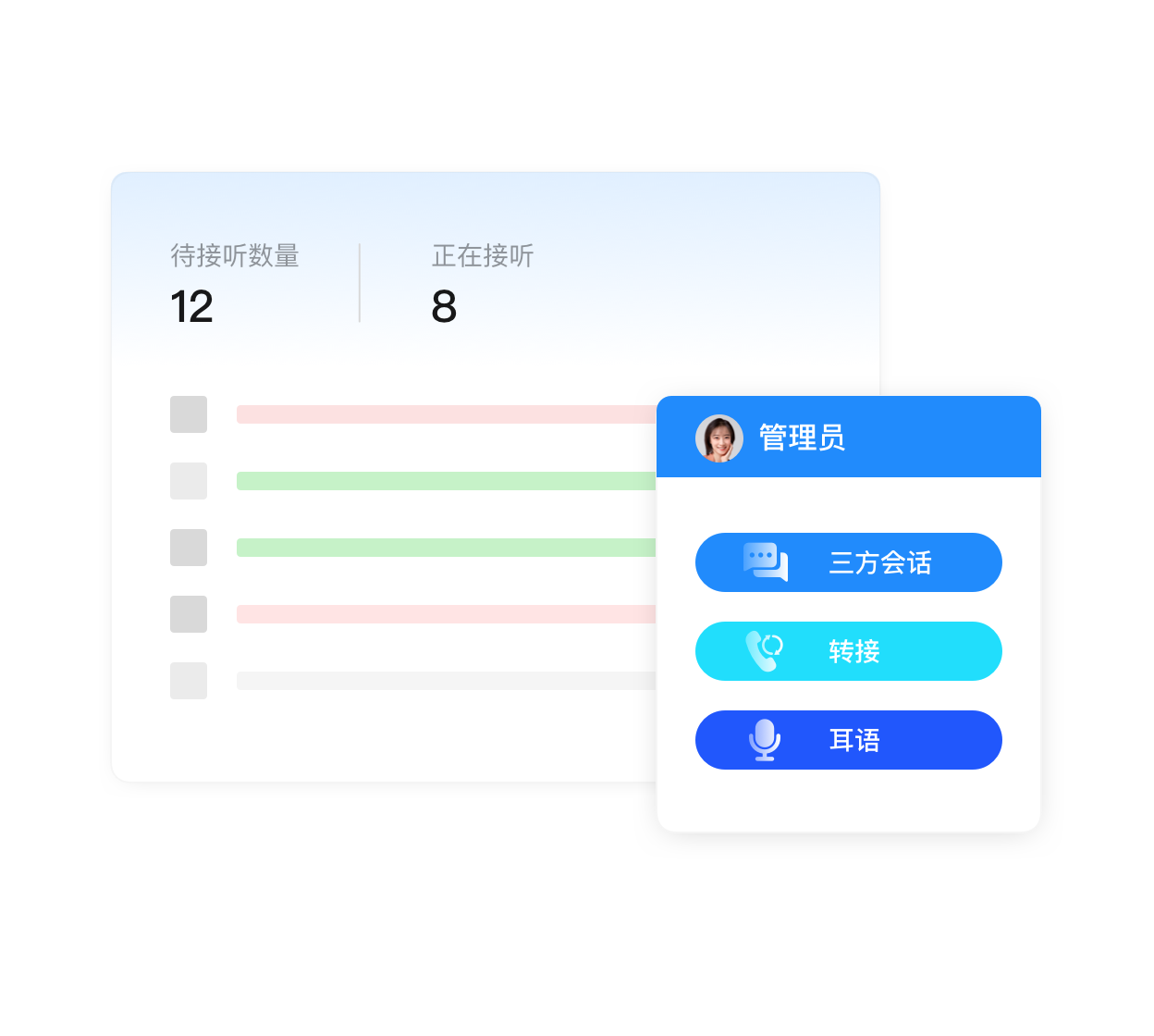 實時展示呼叫中心的接待情況,同時支持管理員進(jìn)行監(jiān)聽、耳語、三方會話